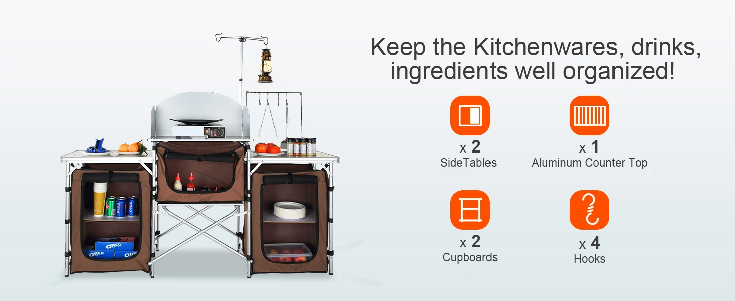 1. Great Space Management: Our camping kitchen table is designed to take your kitchen outside! You can organize your food, stoves, grills, and cookware in an orderly manner on the tabletop, zippered storage compartments, side table, and storage shelf. You can hang the spatula, ladle, tongs, etc on the hooks.